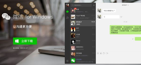 现在用户通过官网即可下载安装微信Windows版客户端,与Mac版的操作方式别无二致,扫二维码登录。后续再登录则无需扫码,打开客户端,点击“登录”按钮,手机端会提示,点击确认即可,整个过程无需输入帐号、密码。
